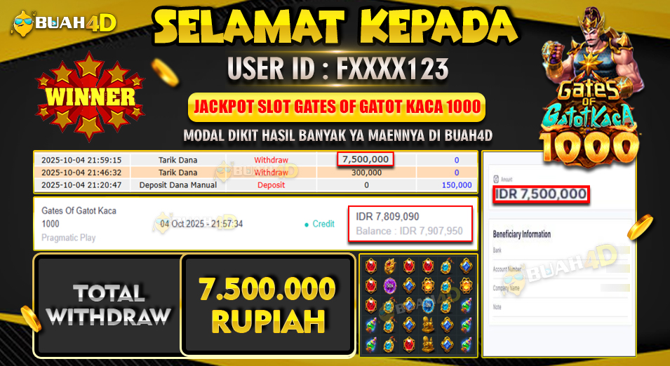 Selamat kepada player FXXXX123 menang Rp 7,500,000