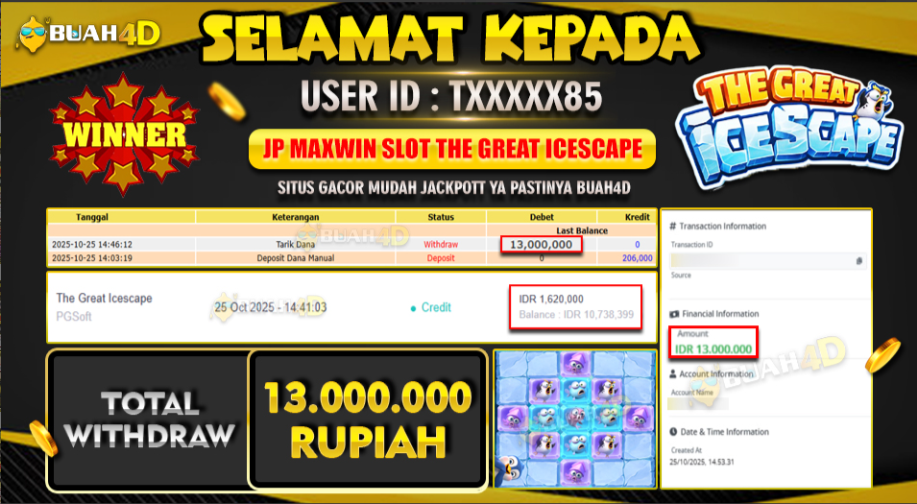Selamat kepada player TXXXXX85 menang Rp 13,000,000