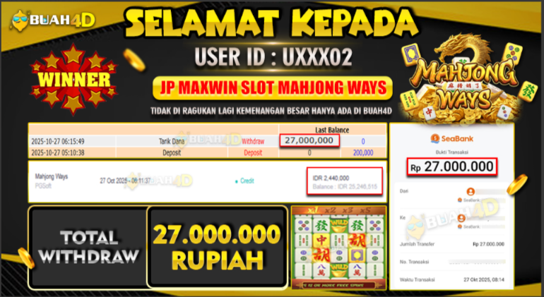 Selamat kepada player UXXX02 menang Rp 27,000,000