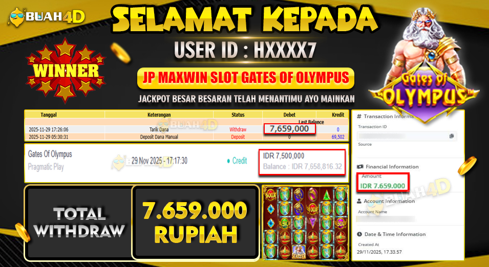 Selamat kepada player HXXXXX7 menang Rp 7,659,000