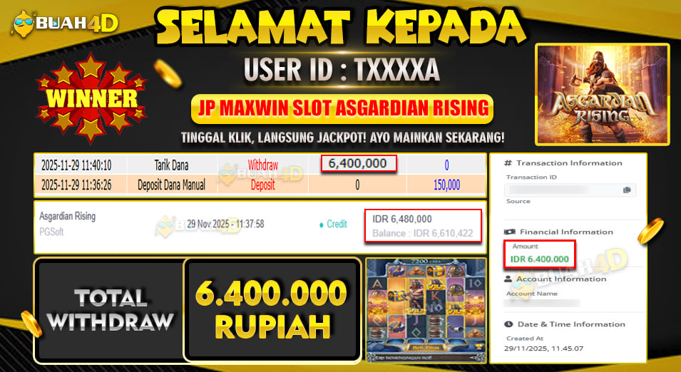 Selamat kepada player TXXXXAmenang Rp 6,400,000