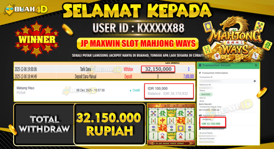 Selamat kepada player KXXXXX88 menang Rp 32,150,000 SEKALI PUTAR LANGSUNG JECKPOT HANYA DI BUAH4D ,BURUAN MAINKAN SEKERANG!! JACKPOT di BUAH4D ♦Tanggal : 06 DESEMBER 2025 ♦Nama : KXXXXX88 ♦Jenis Permainan: MAHJONG WAYS ( PG SOFT ) ♦TOTAL WD : Rp 32,150,000 Hadiah telah di WD (Withdraw) oleh player yang bersangkutan Terima kasih untuk member setia kami telah mempercayakan BUAH4D sebagai BO pilihan anda Post navigation NAGA HITAM PENGHASIL MAXWIN MAXWIN 24 JUTA DI SLOT MAHJONG WAYS – BUAH4D