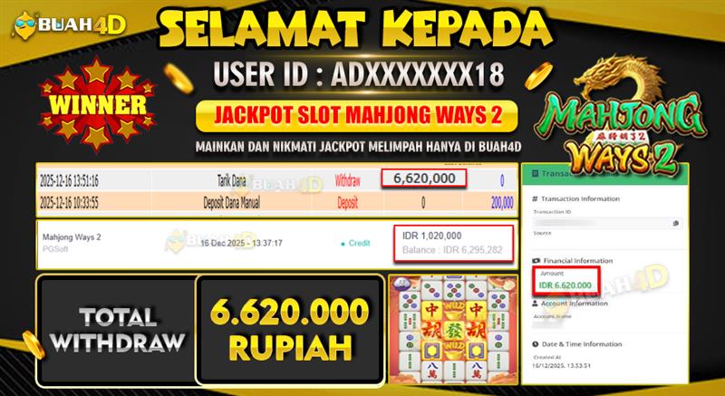 Selamat kepada player ADXXXXXXX18 menang Rp 6,620,000