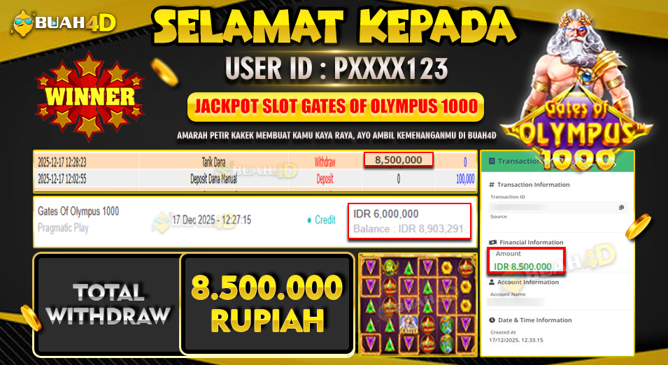 Selamat kepada player PXXXX123 menang Rp 8,500,000