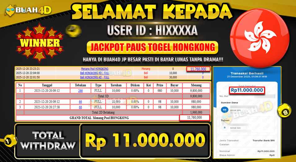 Selamat kepada player HIXXXXA menang Rp 11,000,000