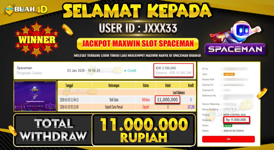 Selamat kepada player JXXX33 menang Rp .11,000,000