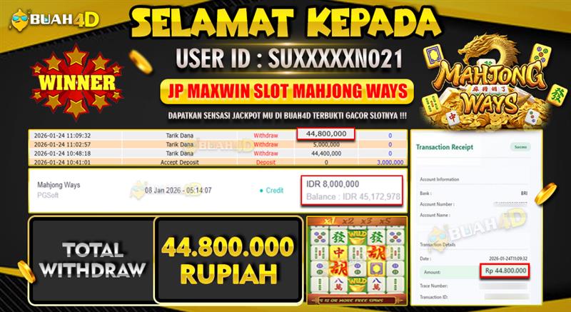 Selamat kepada player SUXXXXXN021 menang Rp .44,800,000