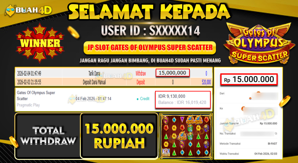 Selamat kepada player SXXXXX14 menang Rp . 15,000,000
