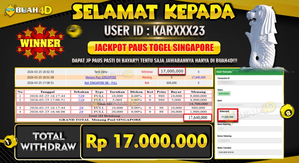 Selamat kepada player KARXXX23 menang  Rp 17,000,000